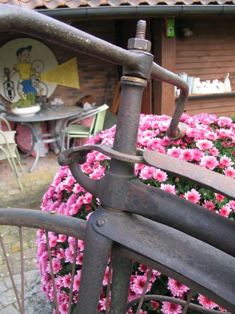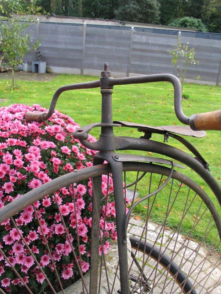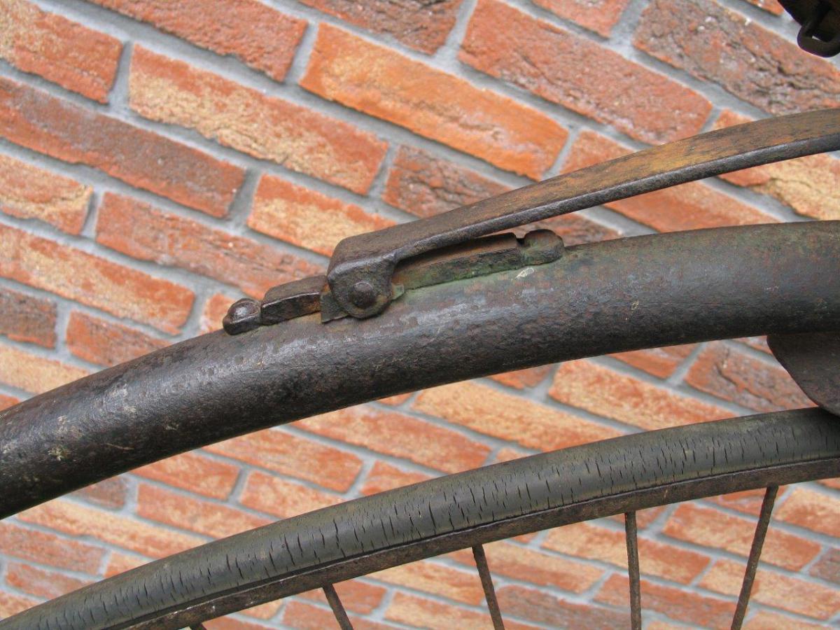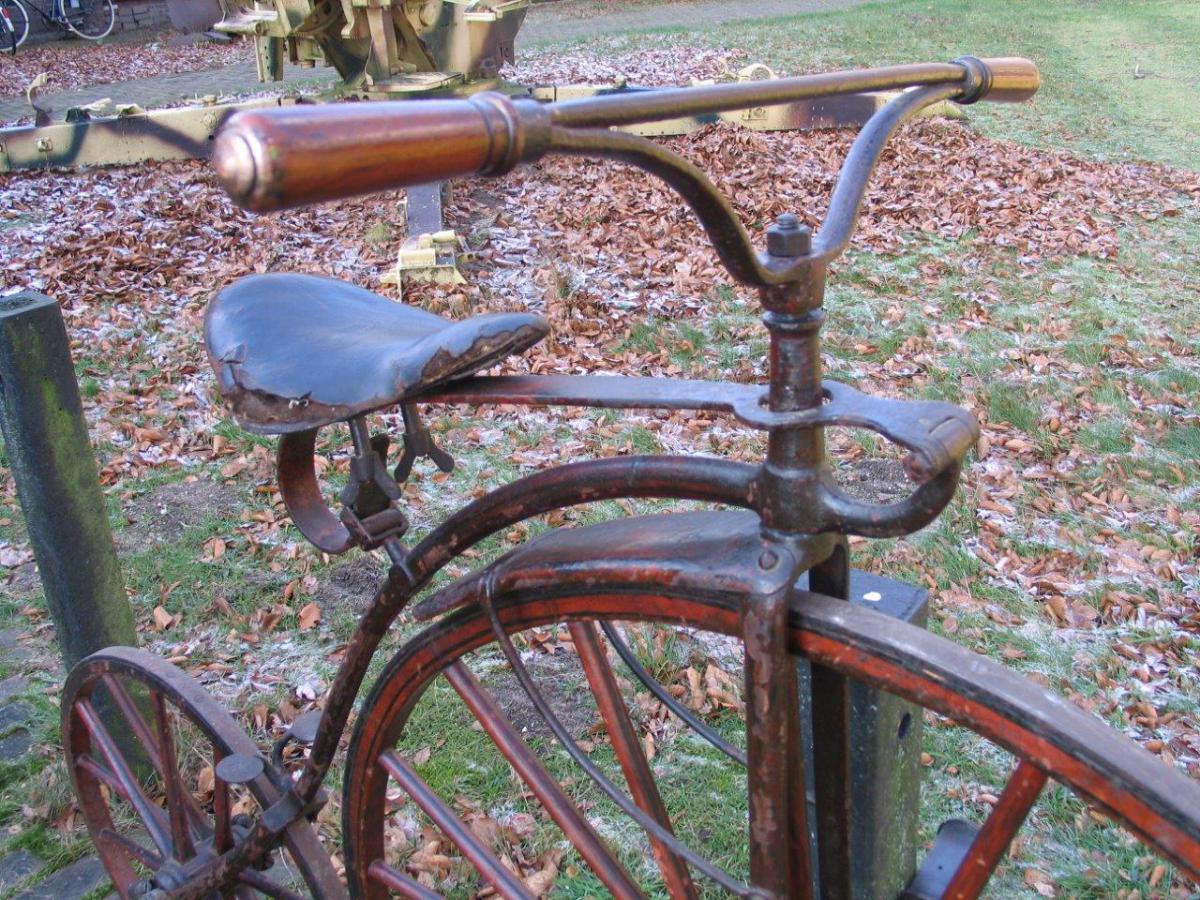 Handlebars may have been changed, but the backbone, with a very clear seam in the tube, looks very authentic. I guess Burgers made some parts themselves and bought pieces (like hubs) in England. This is an explanation for the unbalanced quality of the parts of this bicycle, and the combination of 1870 and 1880's constructions. I found no serial number on this bicycle, but I guess it was built around 1881-1882. Front wheel measures 54 inch, rear wheel 20 inch.