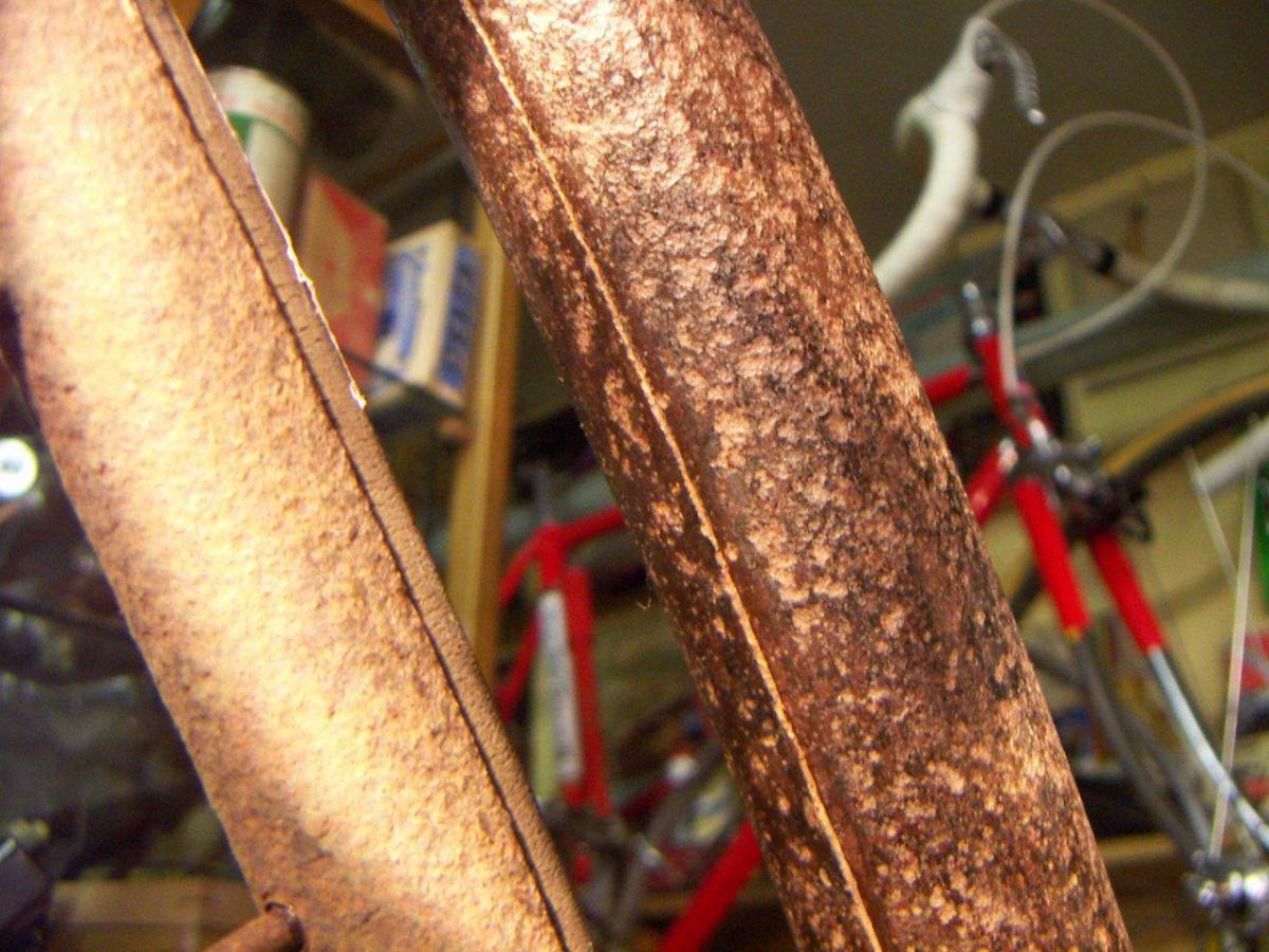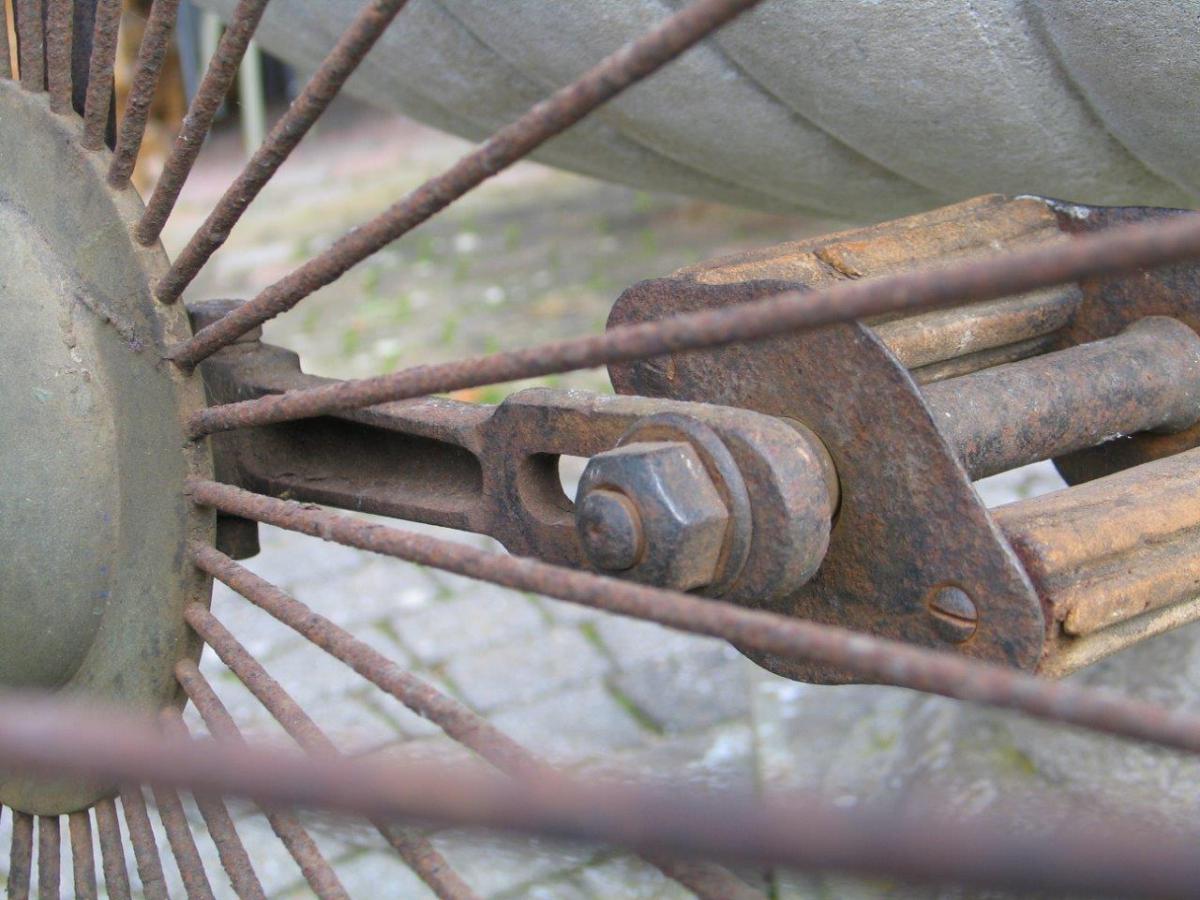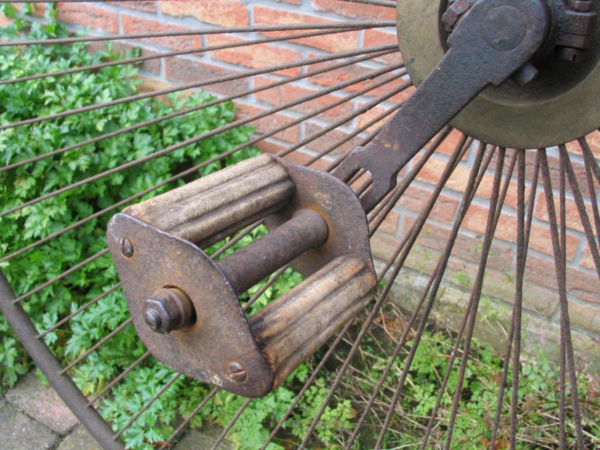Handlebars may have been changed, but the backbone, with a very clear seam in the tube, looks very authentic. I guess Burgers made some parts themselves and bought pieces (like hubs) in England. This is an explanation for the unbalanced quality of the parts of this bicycle, and the combination of 1870 and 1880's constructions. I found no serial number on this bicycle, but I guess it was built around 1881-1882. Front wheel measures 54 inch, rear wheel 20 inch.